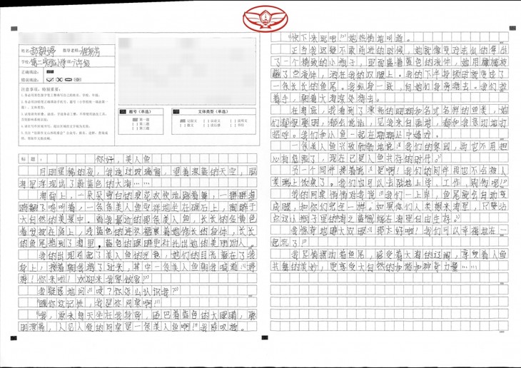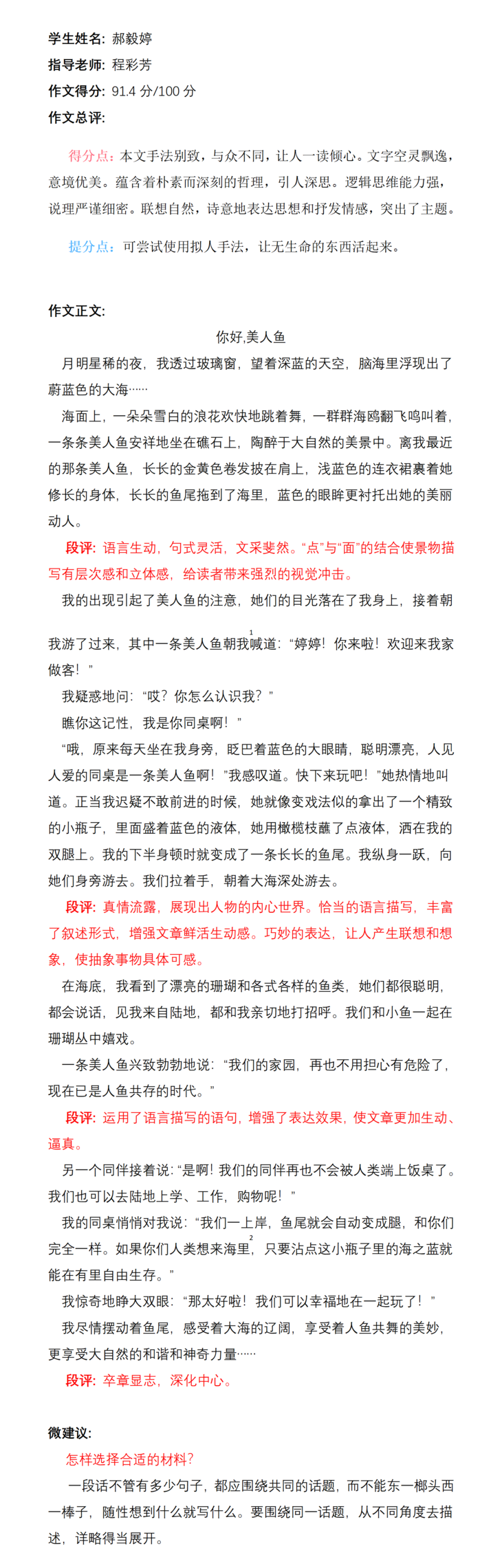 这次习作,孩子采用拟人化手法,将她心目中最喜欢的美人鱼赋予人的行为,不仅展现出人鱼共存的和谐画面,而且将整个世界的美好情景呈现在读者面前,想象力的确丰富啊!加油!