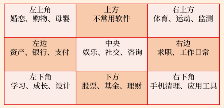 了解方位与飞星的对应关系之后,我们就可以依据每个方位的吉凶特性,结合现代使用习惯,为手机APP进行针对性的布局安排。