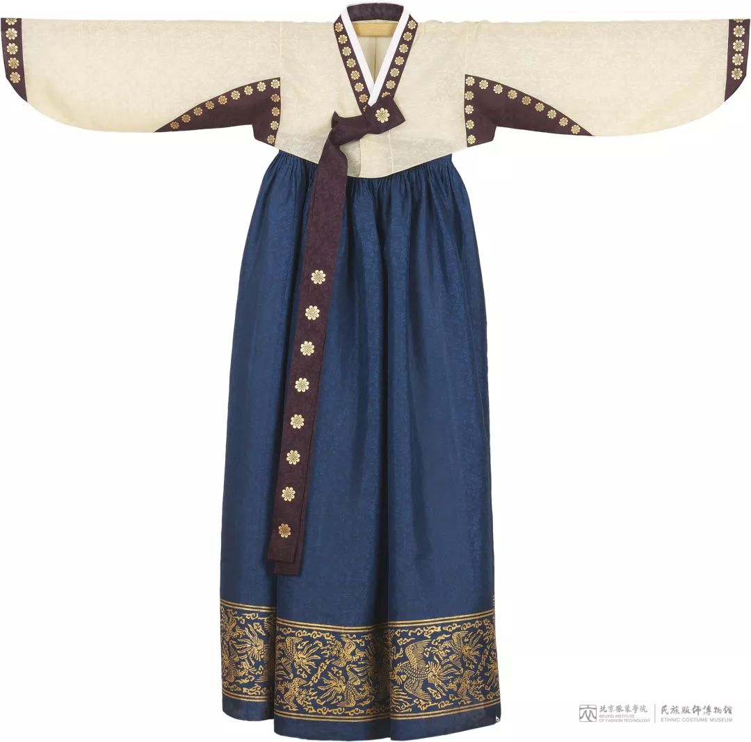 朝鲜族传统服饰的特点是斜襟,没有扣子,用长带打结的方式固定。上衣为白色提花绸 “则羔里” 中装饰最为华丽的“三镶则羔里”,即在领、袖口、腋窝及飘带上,用褐色绸缎镶边并饰以烫金花卉纹样。这种服装最早只能贵族妇女使用,后来成为朝鲜族民间广泛使用的服装。