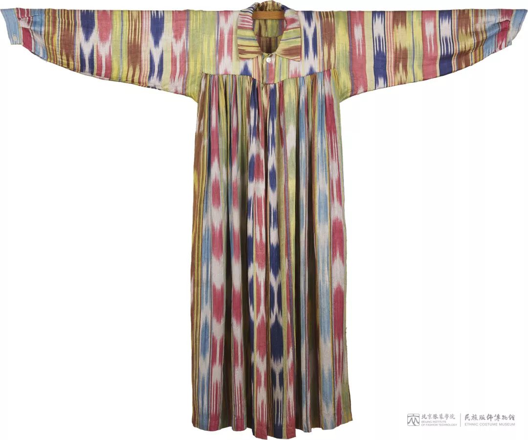 艾特莱丝裙是新疆维吾尔族妇女喜爱穿着的民族服饰。质地柔软,轻盈飘逸,尤其适合夏天穿着。色泽十分艳丽,把各种基色有规则地进行排列。与沙漠边缘单调的环境色彩形成强烈对比,突出了维吾尔族人民对现实和未来生活的热恋和追求。
