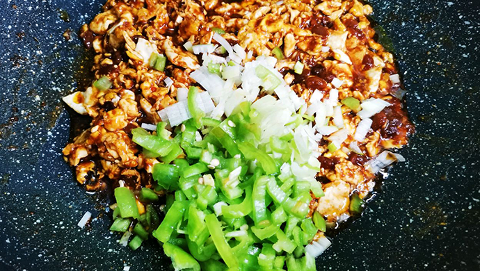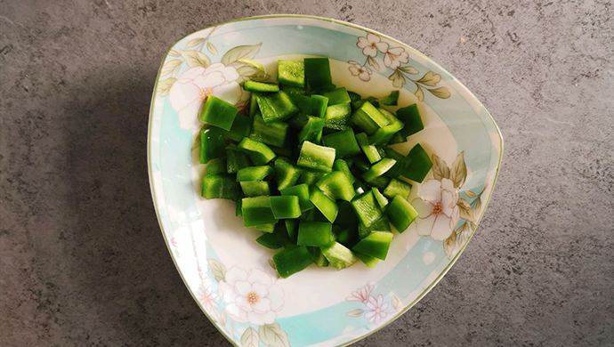 1、半个柿子椒清洗干净,用刀拍,然后切成条再切末;