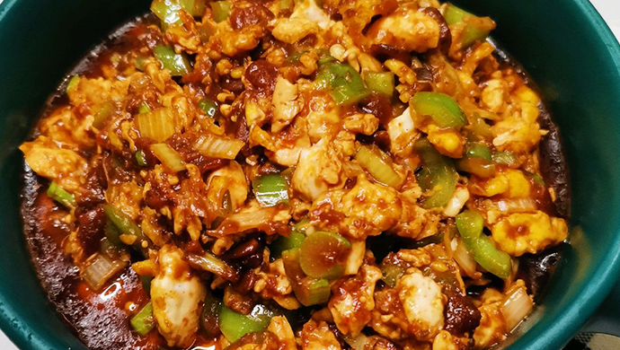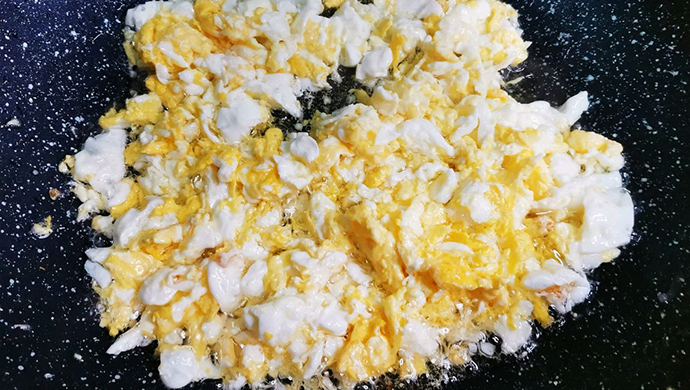 1、锅烧热后放入油,油起轻烟后关火,把鸡蛋打入锅里,开火把鸡蛋炒碎;
