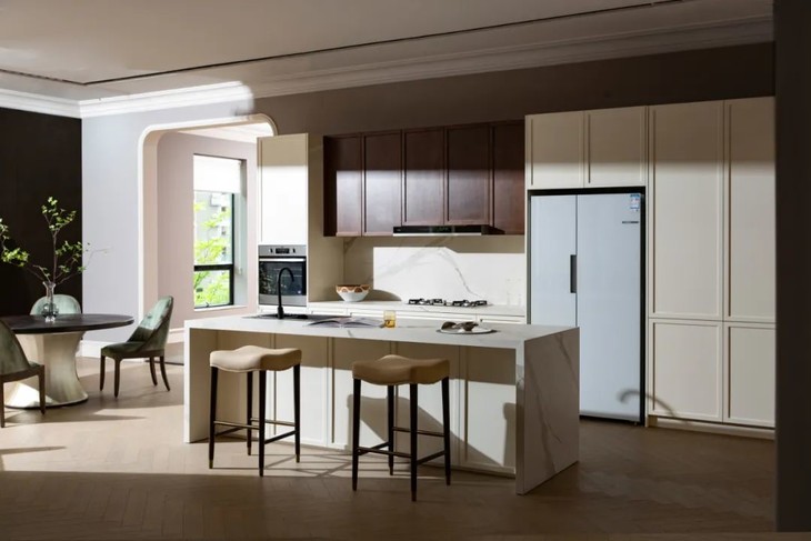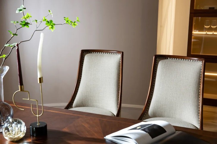 一张经典的美式餐桌,延伸出时光的浸润与美好。VINTAGE优雅诠释餐桌上的装饰艺术,优选实木框架,精致的复古手工拼花工艺,呈现出木材原始的温润质感,深邃的胡桃木色,带着自然的质朴温度。搭配优雅舒适的铆钉软包餐椅,在阳光下显露大气雅致的风格,落座其间带来妙不可言的用餐体验。
