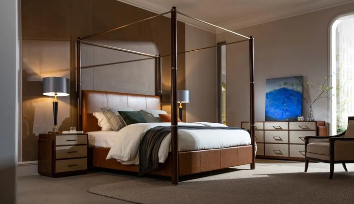 VINTAGE系列中复古柱床整体设计化繁为简,简单利落的线条计,典雅厚实的造型让空间感沉稳。整体材质精选实木框架,加上锻造金属的元素,光泽感十足的棕色油蜡真皮显露出众的品质感,细节上温润木柱镶嵌黄铜装饰,展现简约复古的气质氛围。