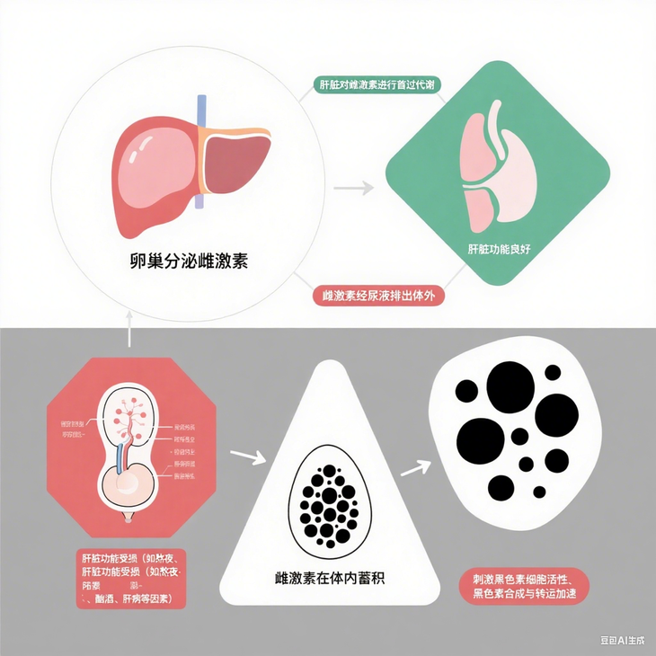 雌激素代谢失衡是关键,肝脏负责代谢雌激素,肝功能不佳时,雌激素水平升高,就像给黑色素细胞按下了 “加速键”,导致面部尤其是颧骨、额头部位色素沉着。