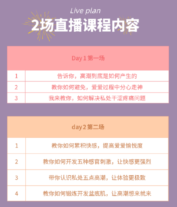 两场直播课,每一场都是爱经经典课程,帮助提升你的性福指数,让你在亲密关系中能够游刃有余!