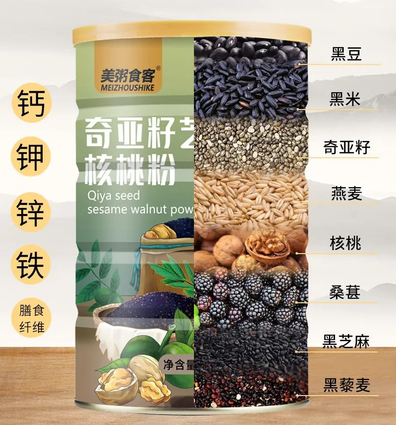 这款【奇亚籽黑芝麻核桃粉】精选8味食材:奇亚籽、黑芝麻、黑米、黑豆、核桃、桑葚,燕麦、藜麦。