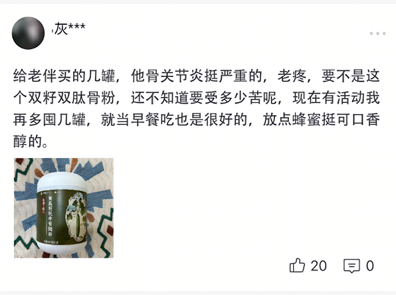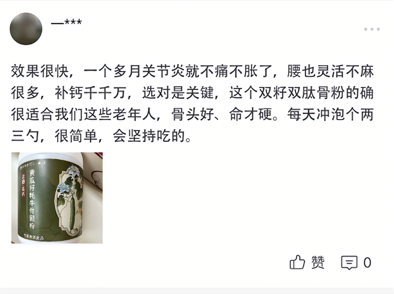 每天早晚喝一杯黄瓜籽骨粉,惊喜发现原本疏松的骨质,密度开始逐渐增加,腰腿也有劲了,关节僵麻肿胀缓解,更加灵活,生活质量提升。