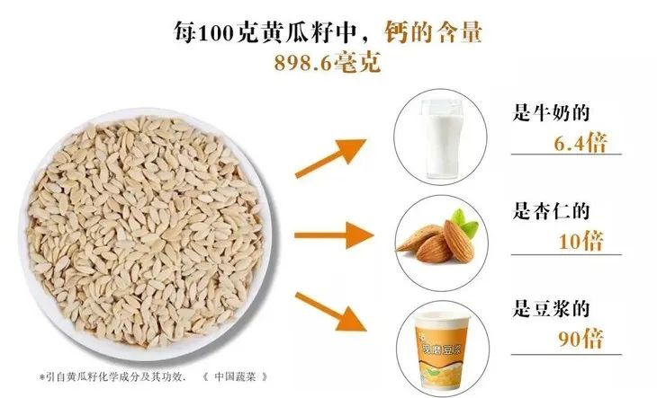 黄瓜籽含有极高的植物钙,每100克含钙898.6毫克,普通牛奶每100克仅含钙140毫克,是牛奶的6.4倍!