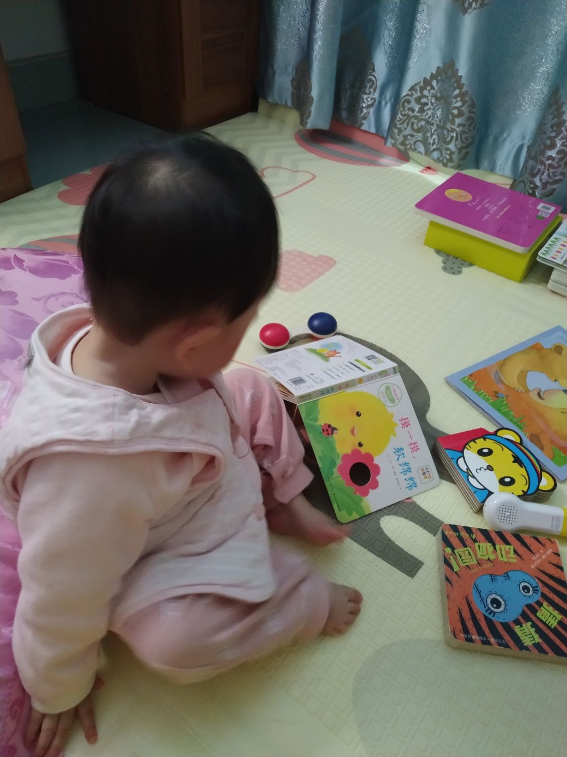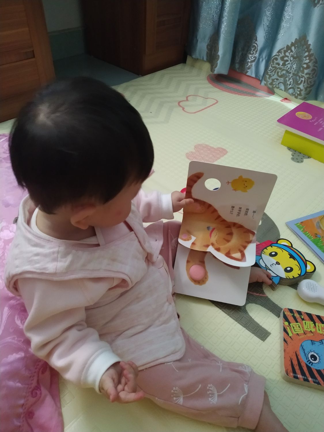 《摸一摸,软绵绵 》,这本书是小鸡球球触感玩具书中的其中一本,里面分别用小猫的掌心、小熊的鼻子和屁股展现出“软”的特性,软软的触感正是这个月龄的小朋友最喜欢的了,妞妞好奇得摸摸,按按,拍拍,最可爱的是竟还想着抠出来。