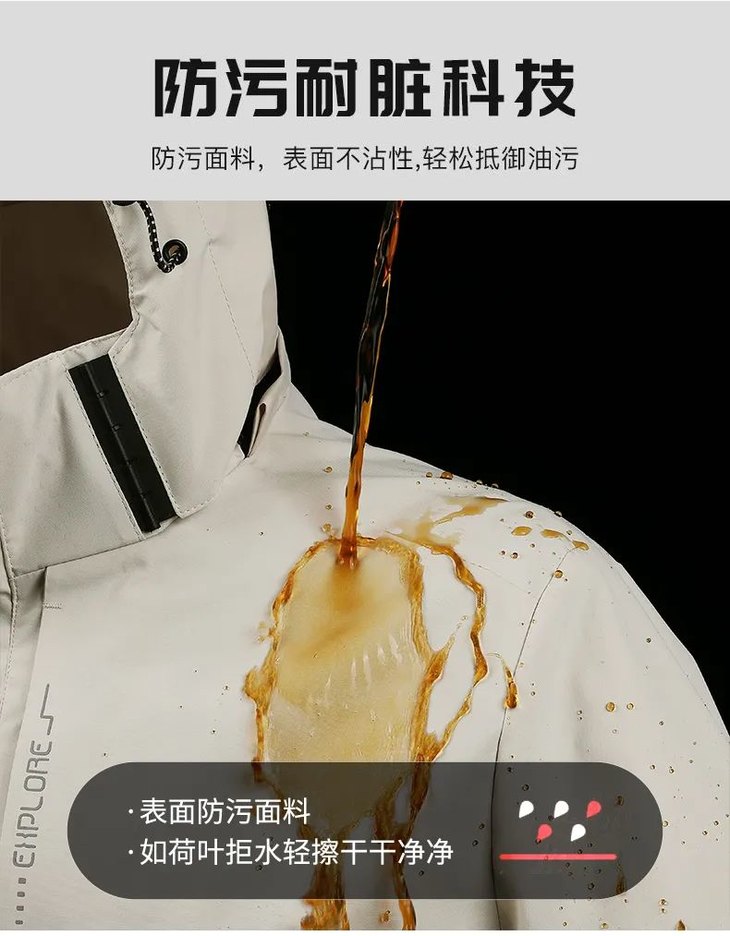 水泼过来就像给身体穿了一层防护服一样,污渍和水碰到衣服料身就会迅速弹开。抖一抖就能把水珠弹开。