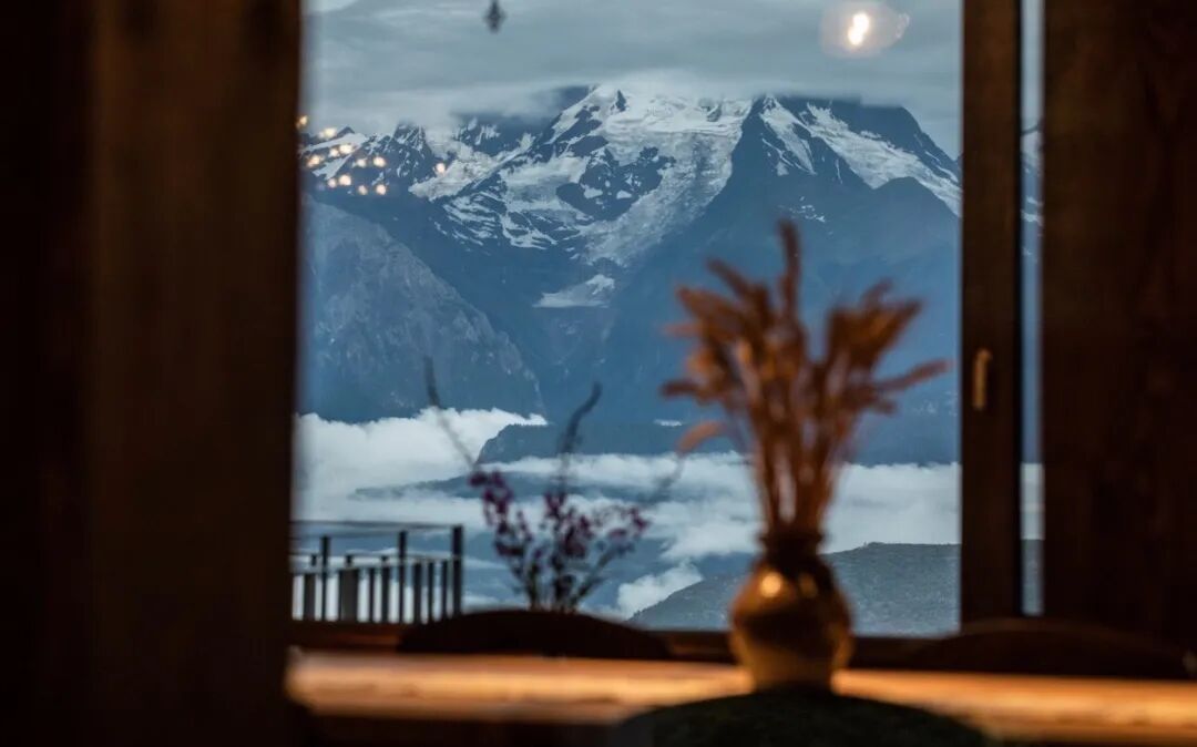 当太阳的金光漫射过雪山之巅,打开房间的落地窗,伸手便能捧住日照金山的“幸运”