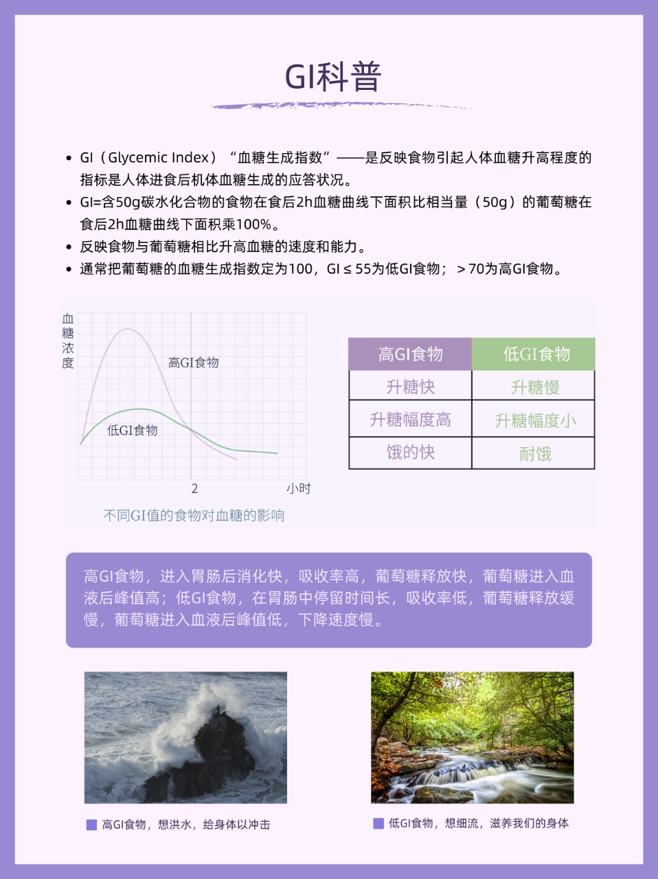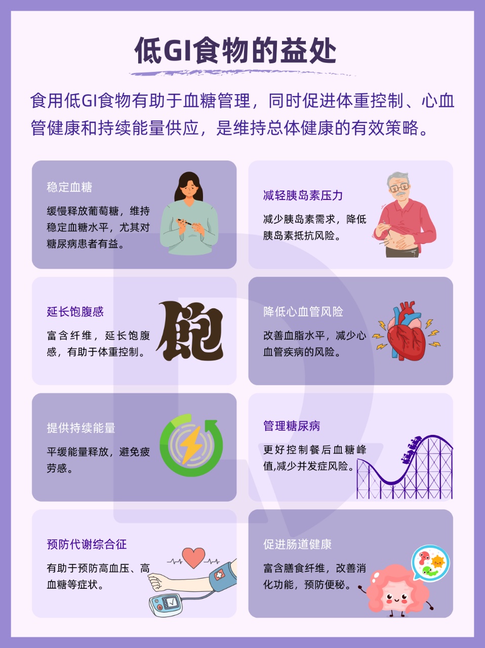低GI食物(GI≤55)消化吸收慢,血糖上升平稳,能提供持久的能量,避免血糖骤升骤降带来的疲劳和饥饿感。