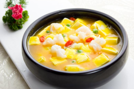 1.虾去头、去壳、去虾线。嫩豆腐切小块。两个咸鸭蛋黄捣碎。黄瓜切丁。