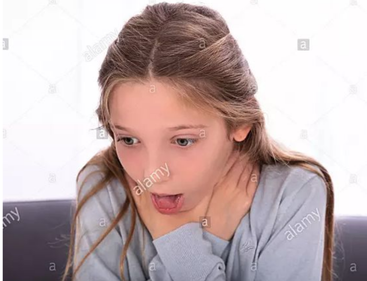 孩子被异物梗住呼吸道后,孩子会出现咳嗽、吞咽困难表现;如果异物太大,完全堵住气道后,孩子就不能咳嗽了,多会表现出典型的动作:双手卡住自己的脖子,想咳嗽但是咳不出来,如下图所示。