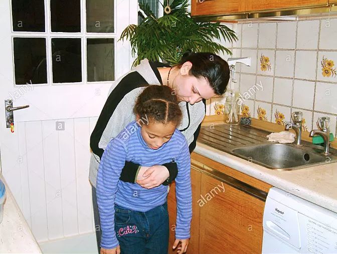 如果异物没有冲出,家长要立即放松手臂,然后重复该动作,直到异物被排出,如下图所示: