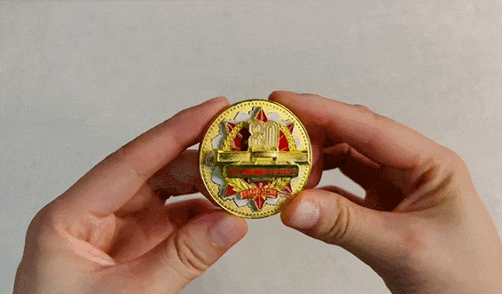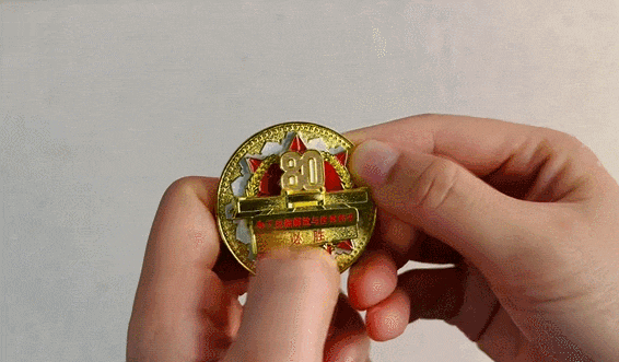 这枚徽章以“抽拉互动”巧思承载历史的厚重,将它凝练于方寸之间:闭合时沉稳内敛,象征坚韧蓄力;展开时锋芒毕露,呼应“胜利终将到来”的历史必然。