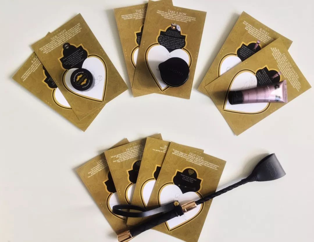 打开盒子,皮革情趣皮拍、情趣卡片、香薰精油蜡烛、白菩提秘膏和素女润滑剂,等你来翻牌!