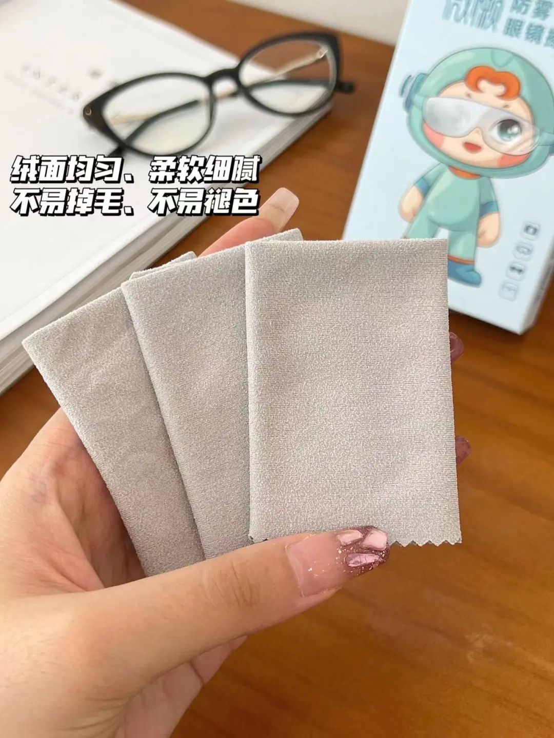 3、一盒三片装,一块反复使用500次,频繁擦拭也不会对镜片造成损伤,材质可靠安心,无异味。