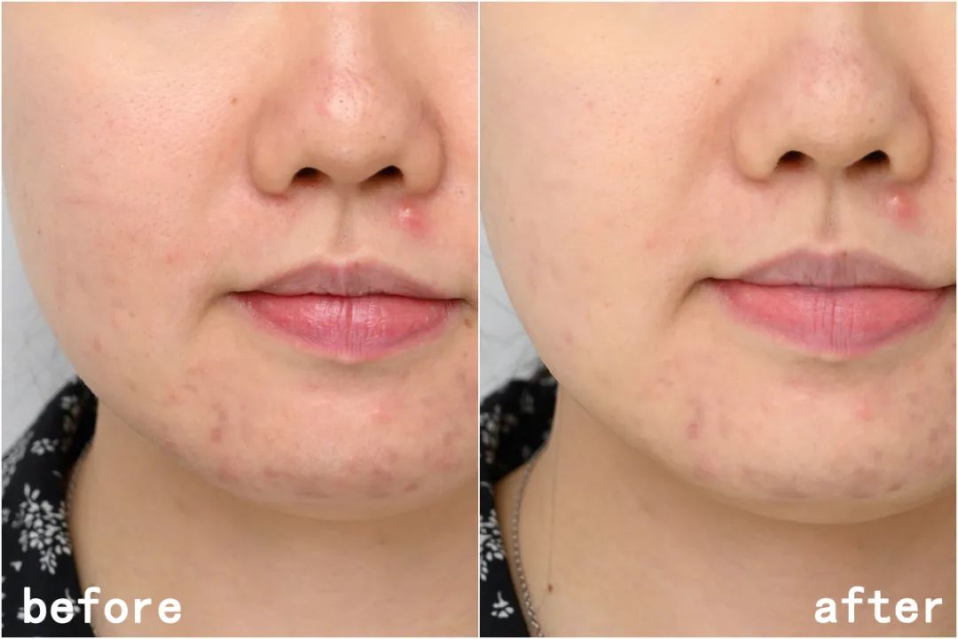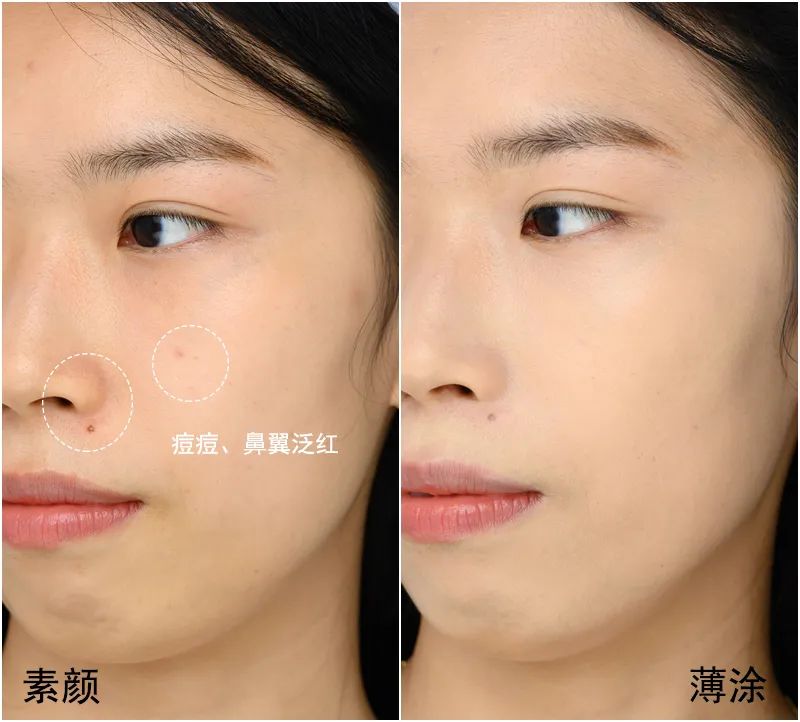 来看看她的对比图,柔焦妆效,又带着自然的光泽感,看起来显得气色好,就像是天生的好皮肤一样。遮瑕力也不错,鼻翼的泛红、暗沉、痘痘,基本都能遮住。▼