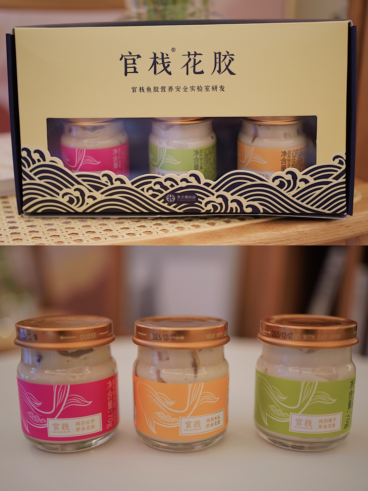 孕期的时候就有吃老妈牌炖的花胶,但是味道腥腥的,不太爱吃~后来妞妞粑粑给我带回来官栈花胶,吃了一次就爱上了~ 一点都不腥,开盖即食,敲方便~ 而且用料很良心,不添加一滴水,都是纯奶炖制的,满满的胶原蛋白~