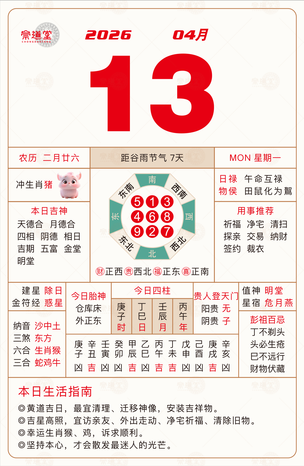 2026年4月13日 农历二月廿六 丁巳日 冲猪