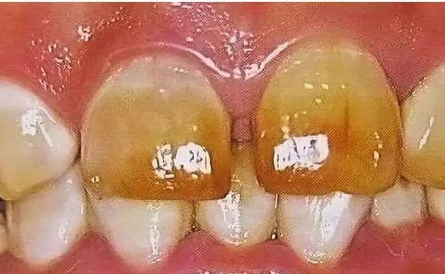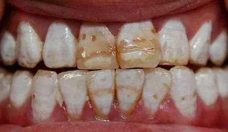 还有一种较为常见的染色牙叫做氟斑牙。这方面主要是小朋友过量的饮用了含氟过高的水(多为含氟的牙膏所致),且又恰逢孩子的牙齿正处钙化期,这使的牙釉质发育不完全。最终让牙表面呈现一种黄褐色的斑块,严重的还可能导致牙釉质的缺失!