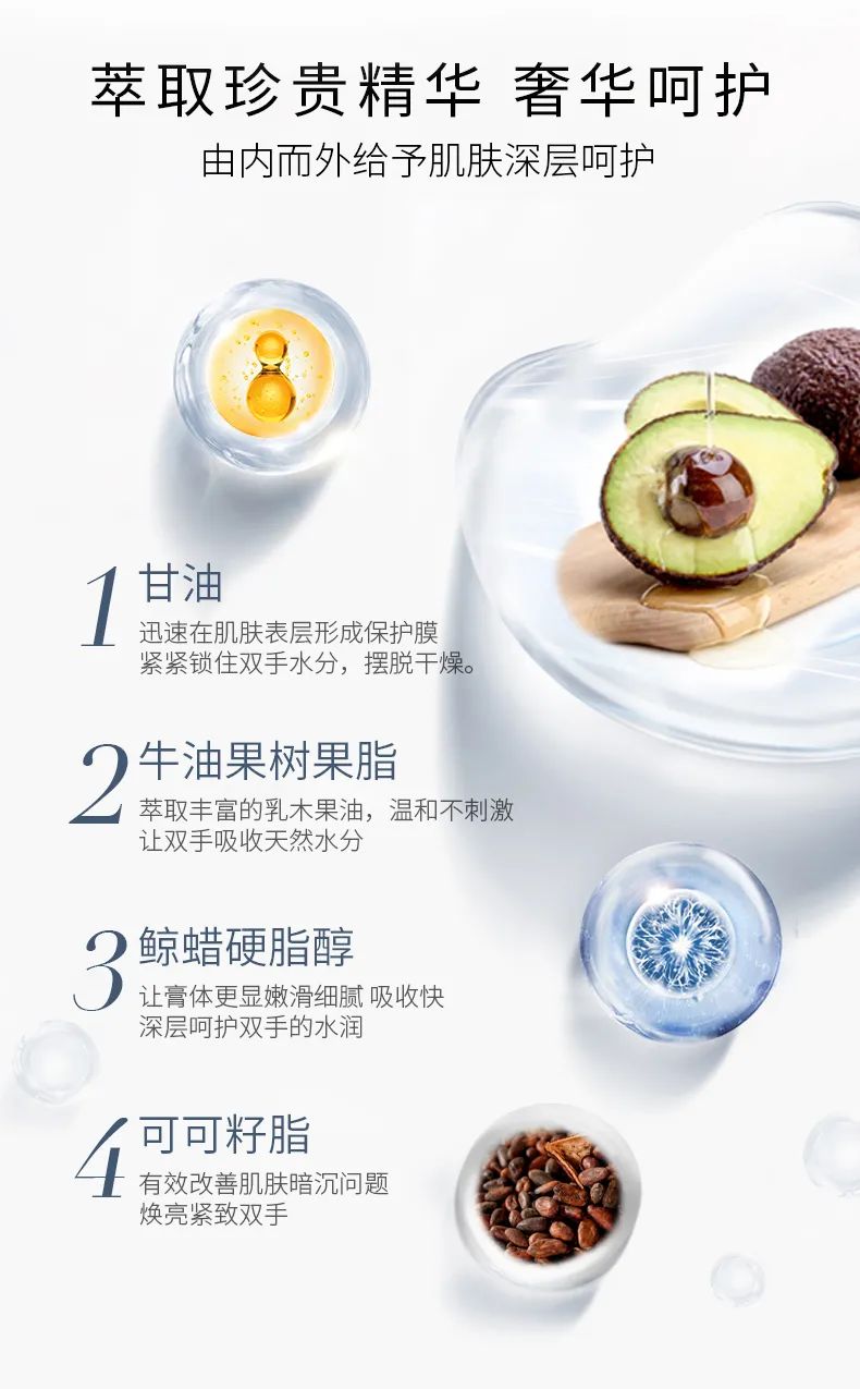天然的乳木果油脂,帮助手部肌肤改善干燥、倒刺等问题,让手部肌肤更加雪白细腻。