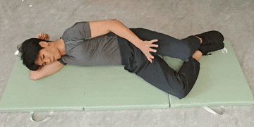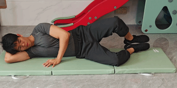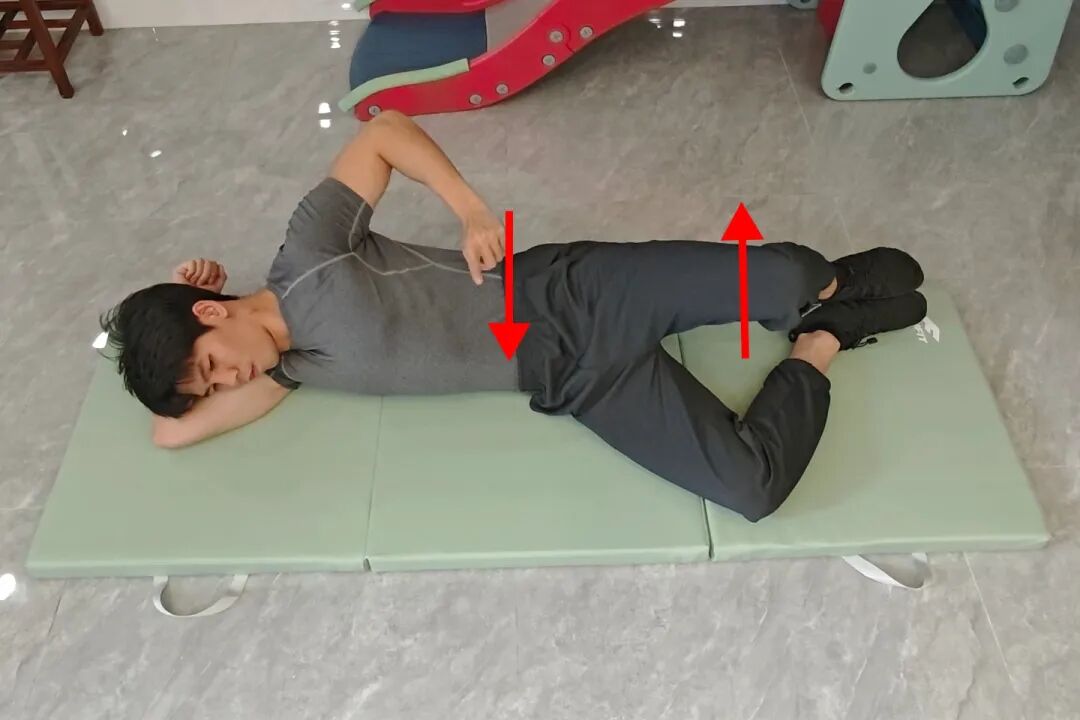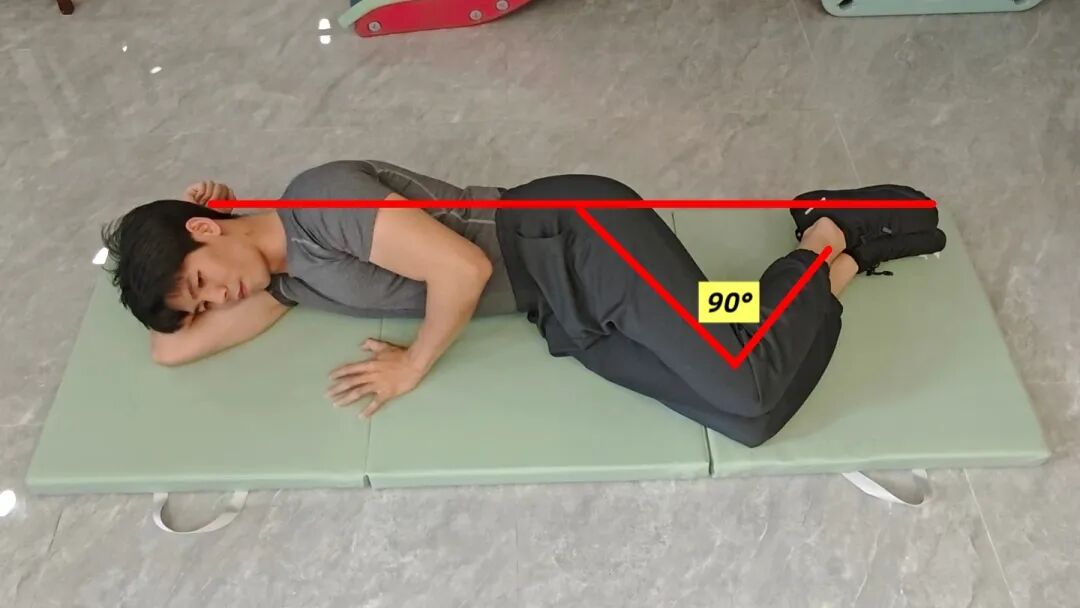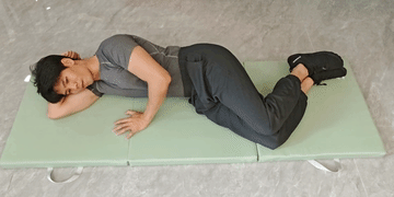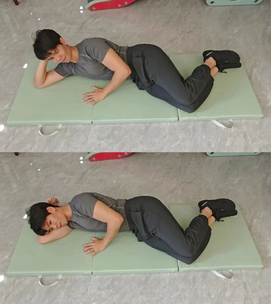 我们先侧躺下来。肩膀和头部的位置,以舒服为主,可以手撑、臂撑,或者枕在枕头上。