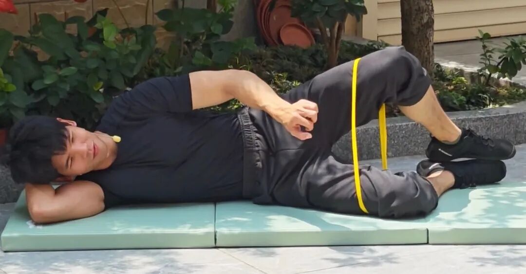 脚保持贴合不动,身体其他部位完全静止,上侧大腿缓慢地打开,打开到你能达到的最高点,然后定住二十到三十秒。
