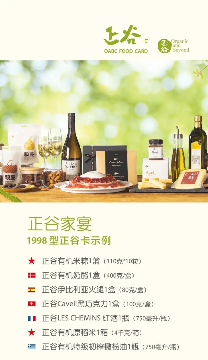 正谷卡4998/2998/1998/1198/898/598等多种规格选择,为您提供独具情谊的端午之礼:以有机食品礼品卡,传递真挚情谊,分享对人与自然可持续发展的关注。