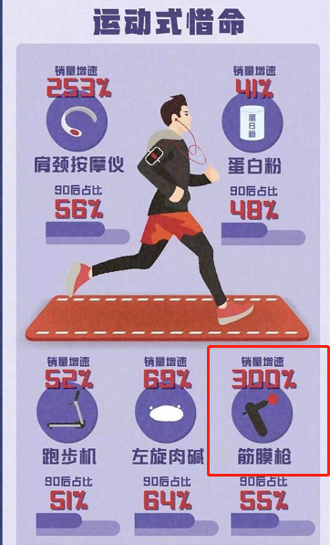 其中,筋膜枪选手一骑绝尘,增速高达300%、每10个年轻人里就有一个拥有它!实火!
