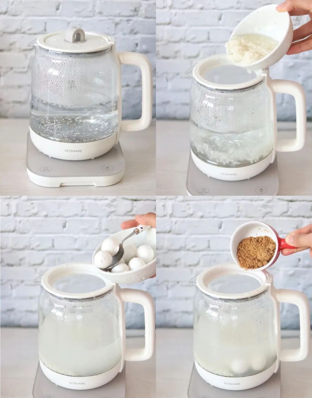养生壶水烧开,加入酒酿、汤圆和红糖,搅匀煮开。