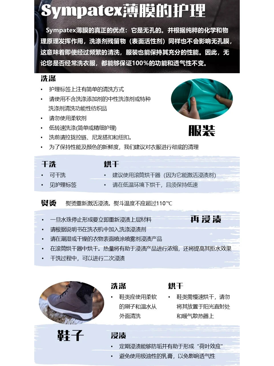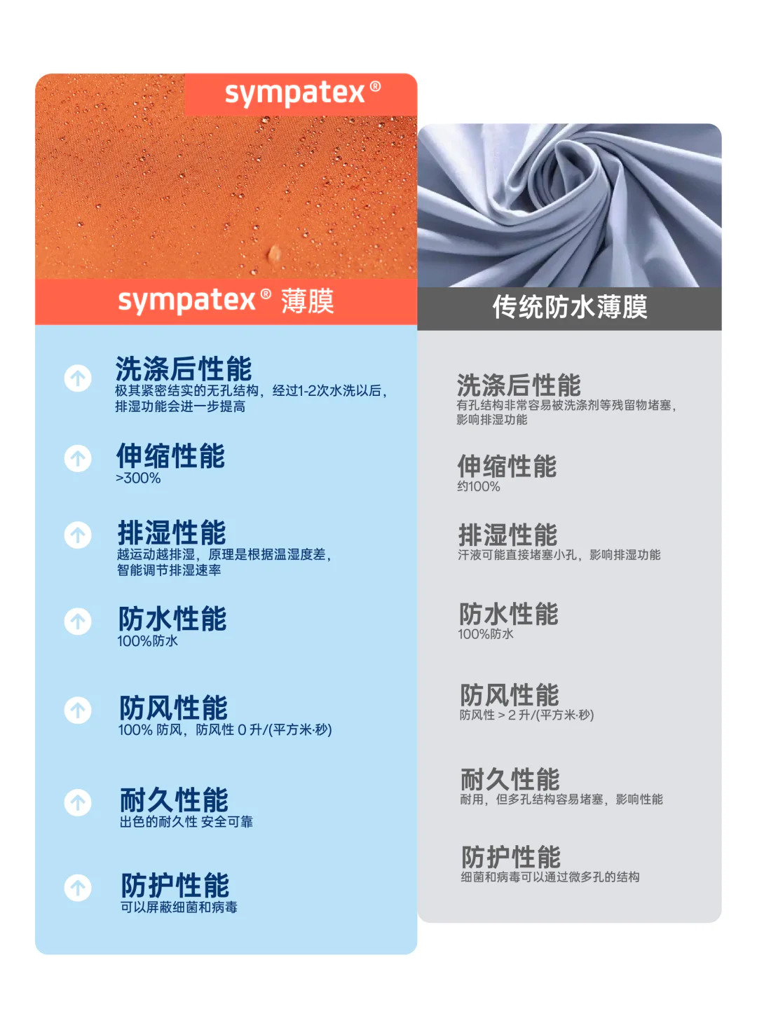 ✔ Sympatex®薄膜无孔结构拒绝性能衰减,越用越稳