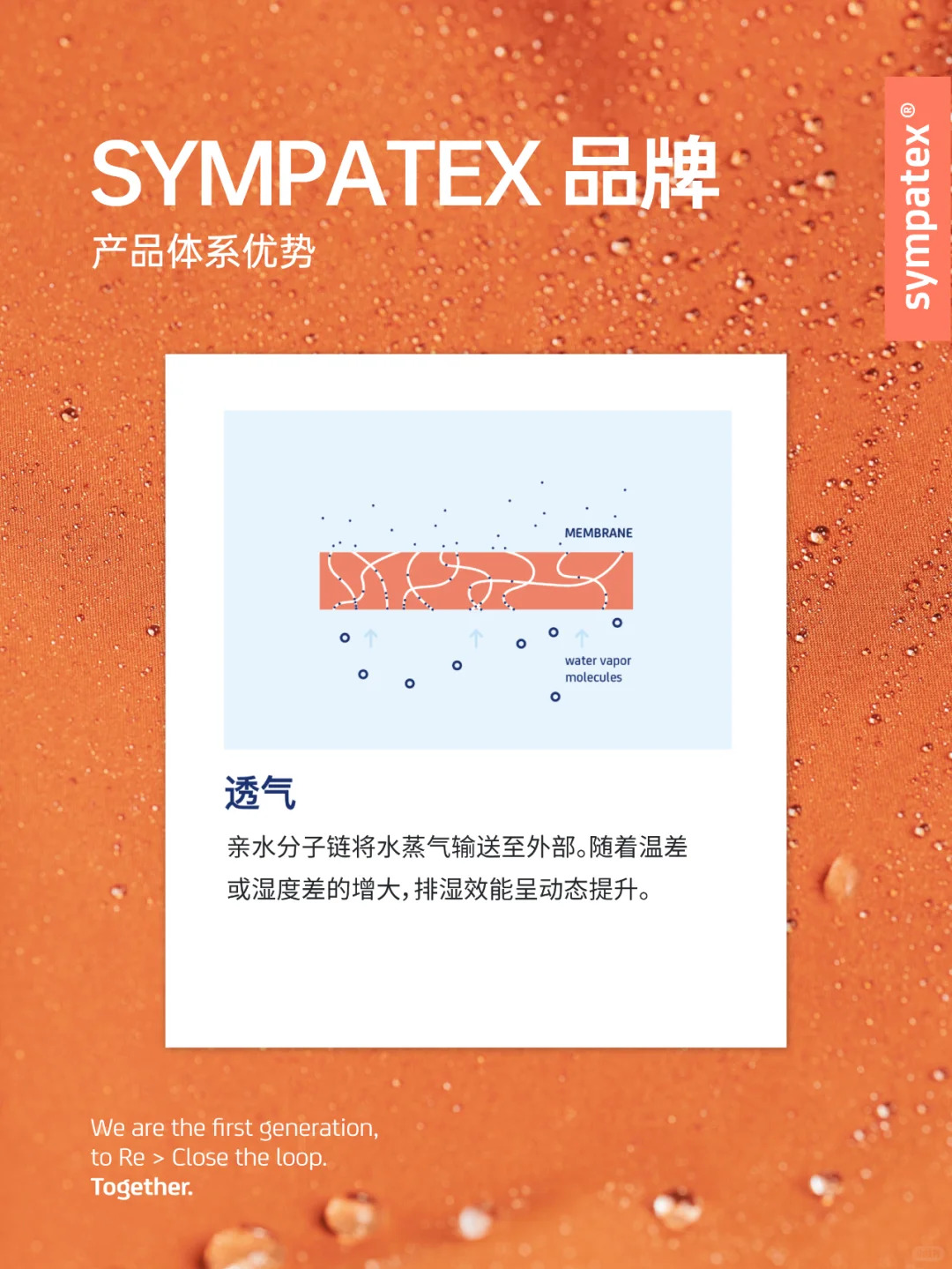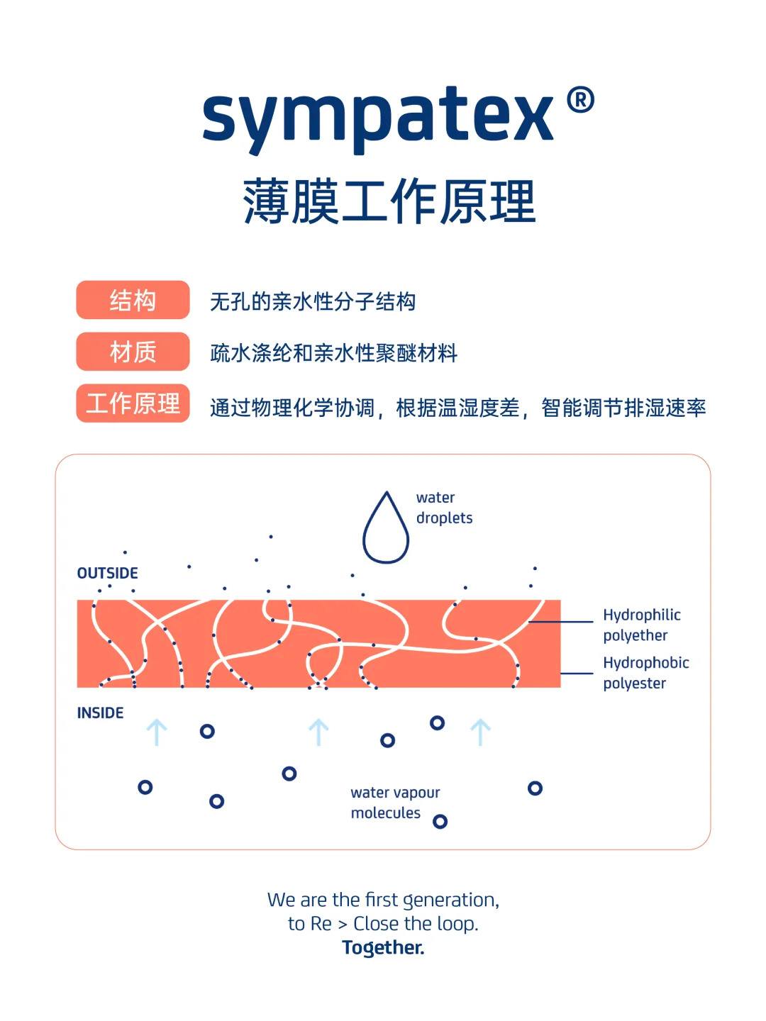 👉 Sympatex®薄膜采用特殊亲水性分子结构,通过物理化学协调,遇汗能加速排湿实现越运动越干爽