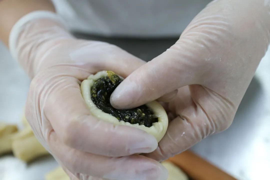 地道的海苔月饼,必须是老师傅经过成百上千次的揉搓,将油一点一点揉进面团中。