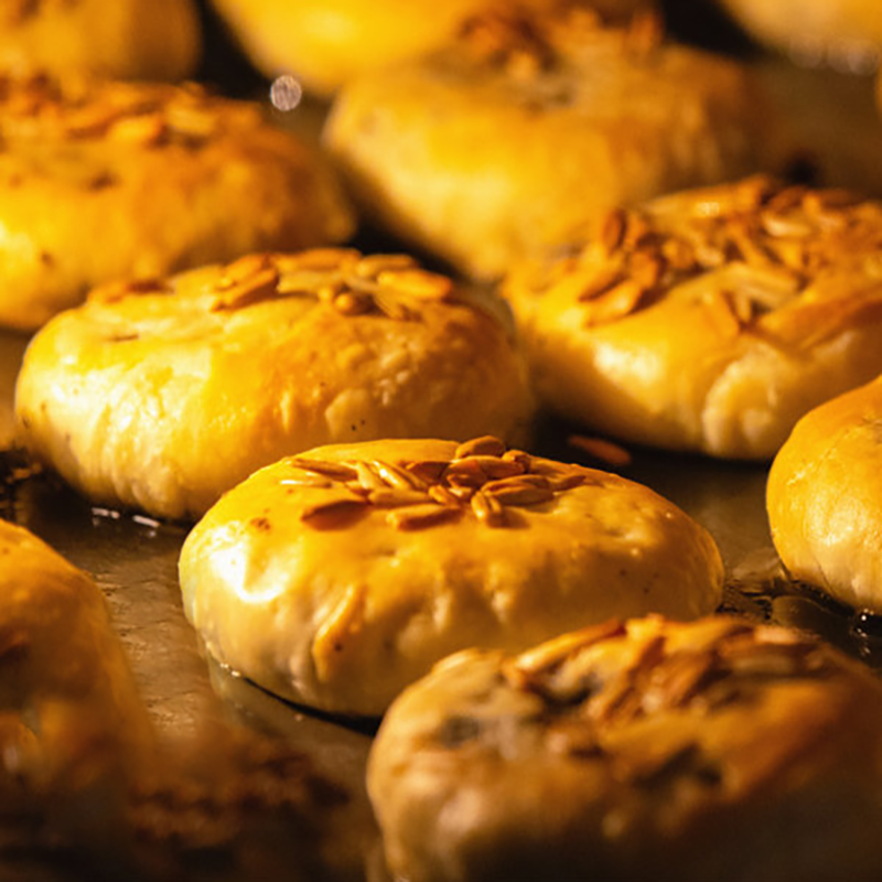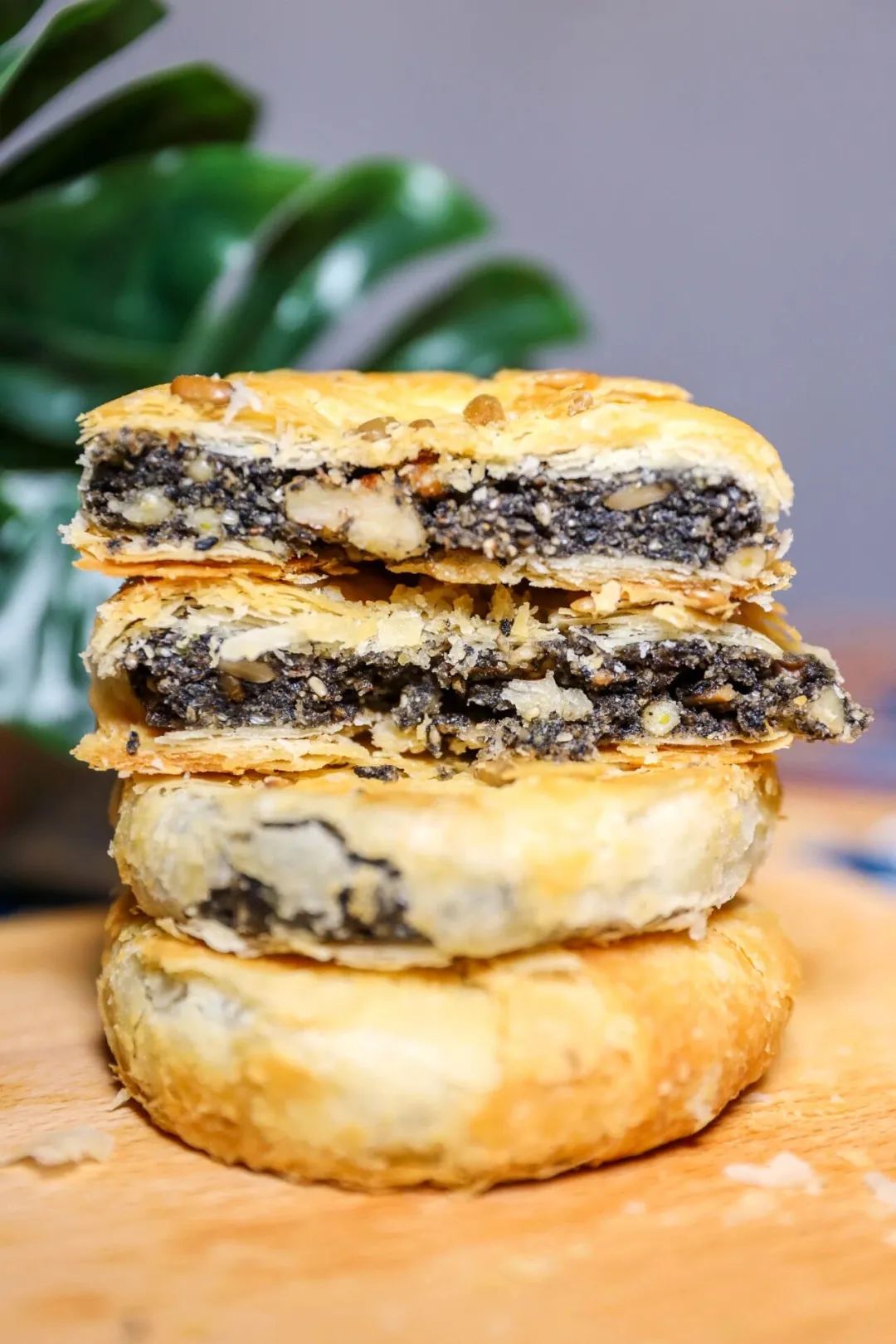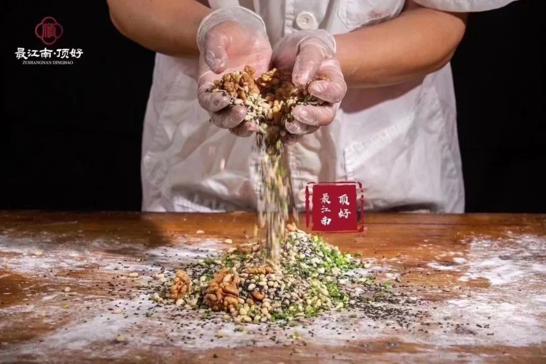 内馅采用优质松仁、核桃仁、黑芝麻等馅料,延续传统手艺制作,馅料肥而不腻,口感松酥、咸甜适中、回味无穷。