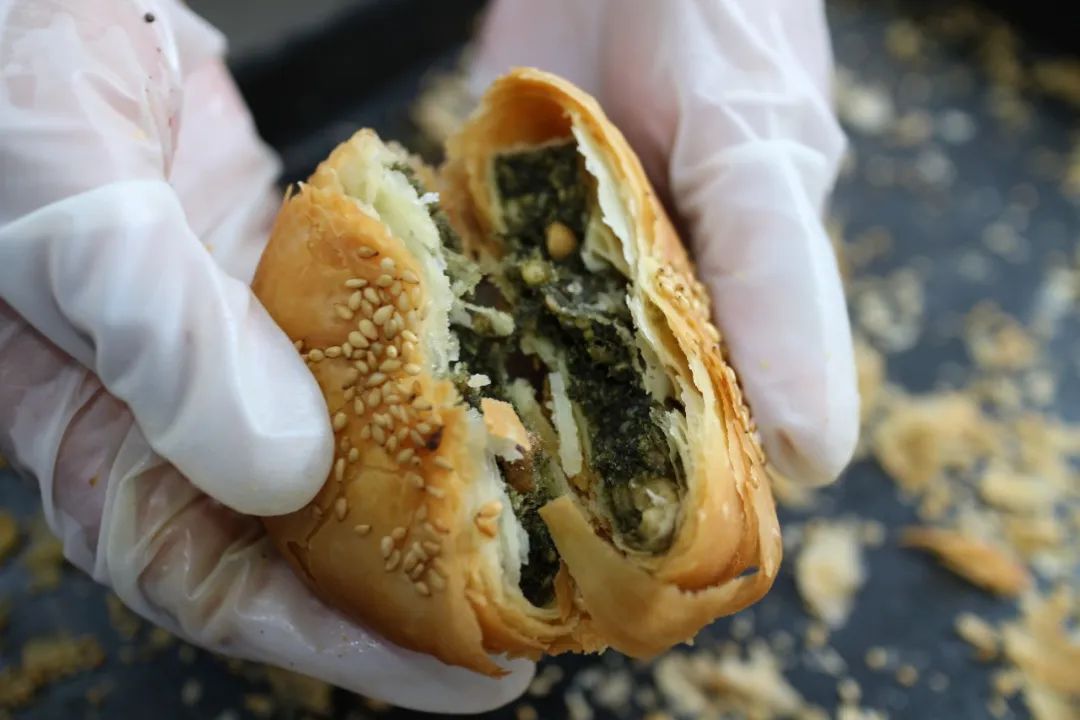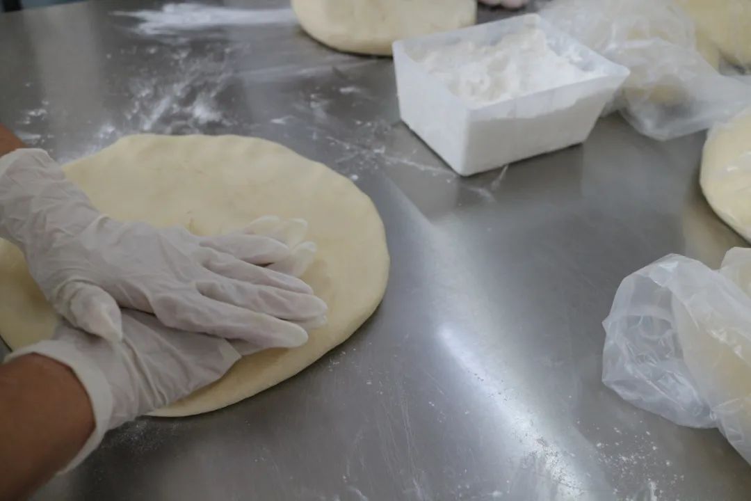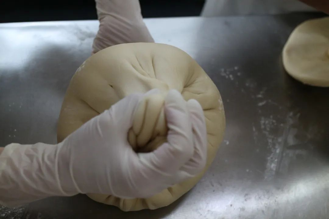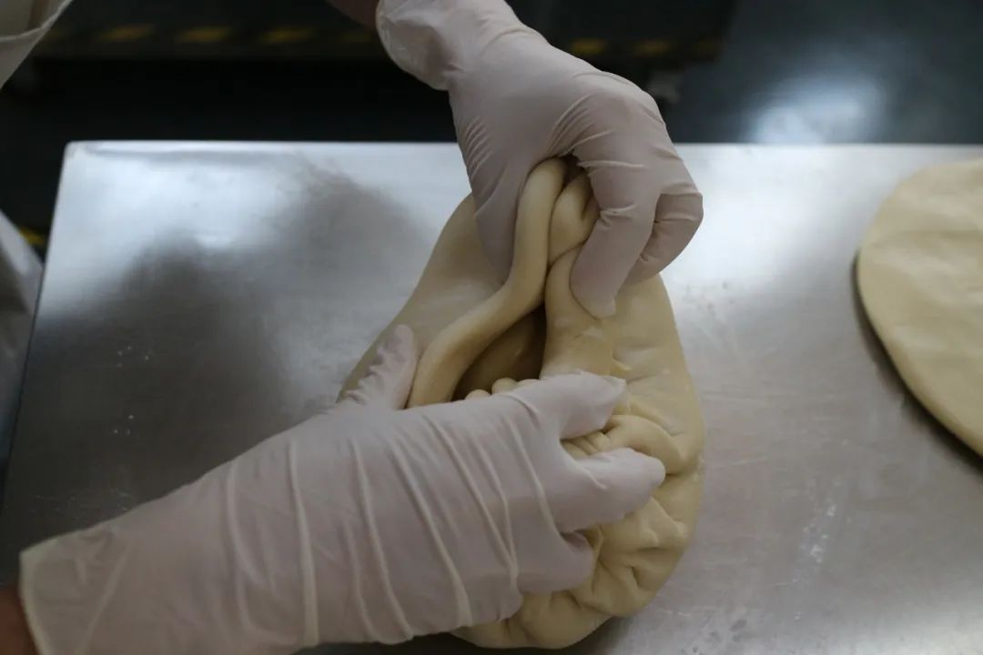 为了让饼皮薄如纸,经过8小时的发酵,反复揉搓,多次敲打,酥脆无比。