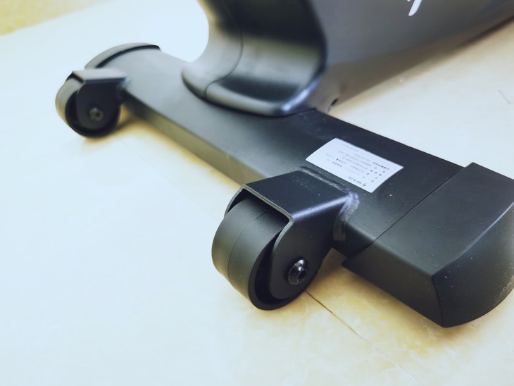 而机器本身为了达到运动的稳定性,整个机身的重量达到了64公斤,可以说是非常重的,所以机器特别在前面设计了两个移动辅助滚轮,方便减轻移动机器的重力,这样我们在运动位置的时候只需要轻抬后面,就可以很方便的推动机器转移位置。
