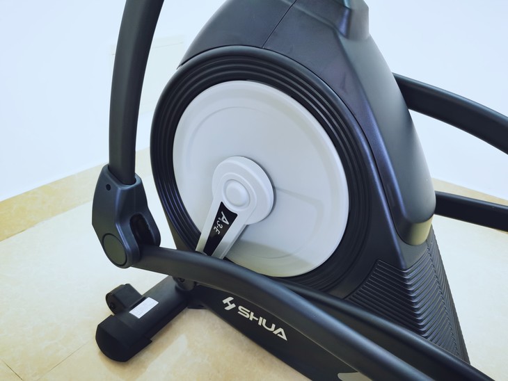 舒华椭圆机采用的是前置磁控飞轮设计,通过人体发力带动飞轮运转,而飞轮则产生一个连惯性的阻力来达到运动消耗的效果.