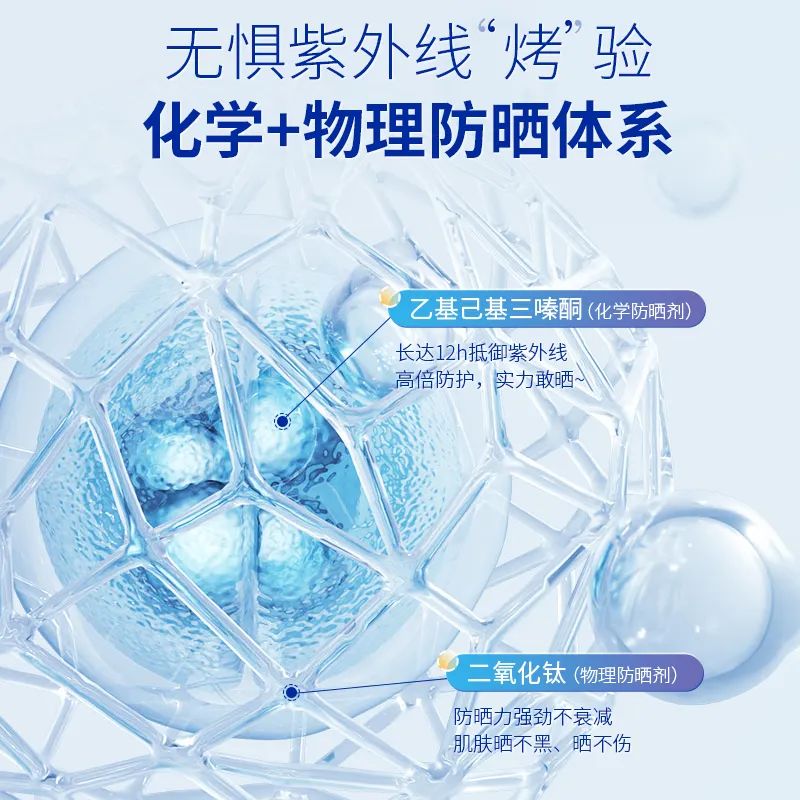 它形成的双重防护屏障,抵御全波段UVAUMB,防护防晒效果更好,防晒力强劲不衰减!