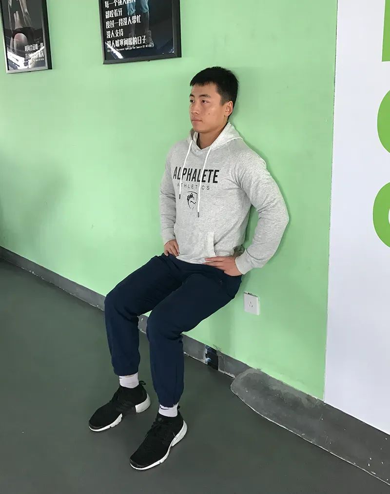 在进行靠墙静蹲时,运动者背靠墙壁,两脚与肩同宽平行站立,然后缓缓下蹲,直到大腿与地面平行或者略高的位置,维持这个姿势数十秒甚至几分钟。