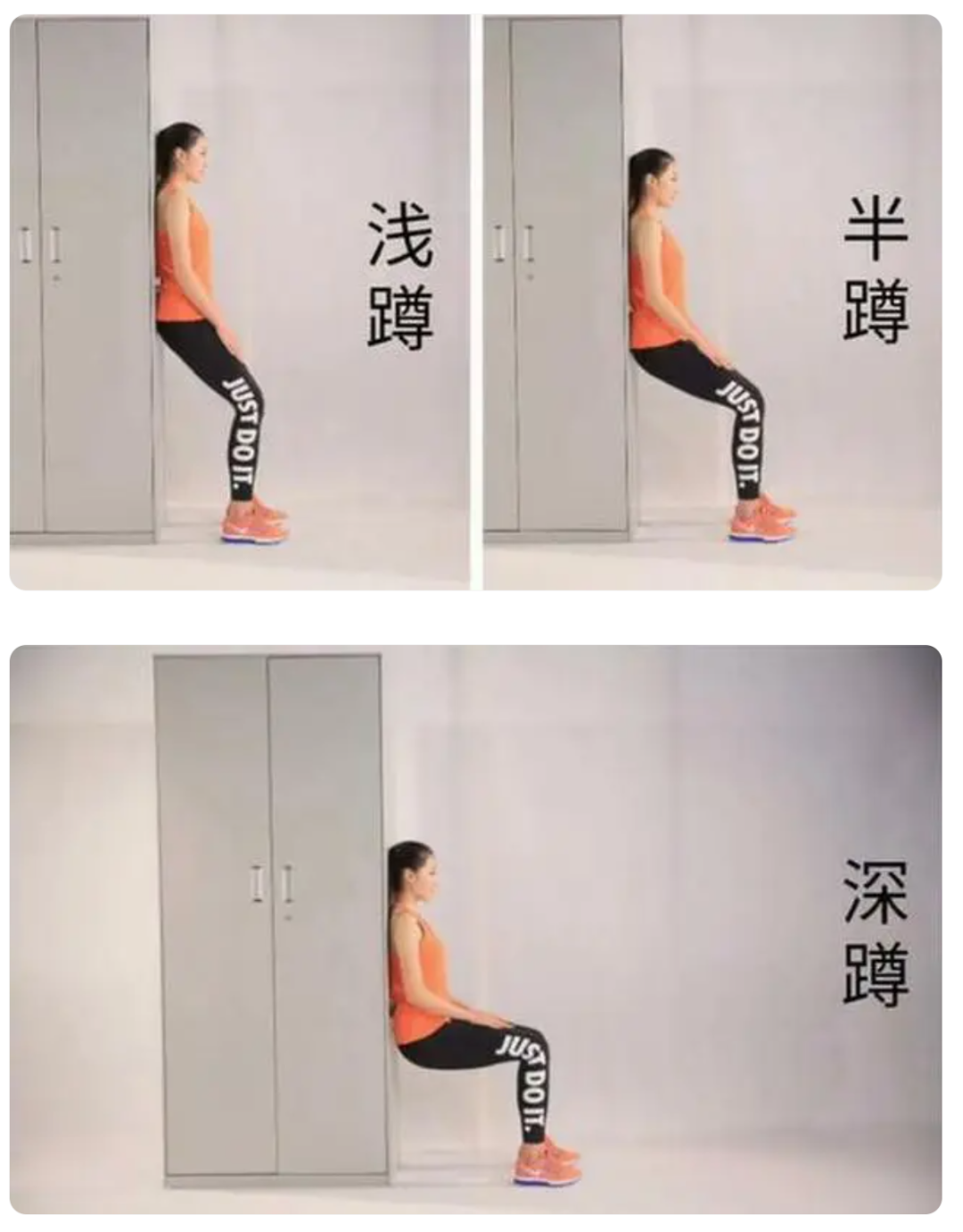 靠墙静蹲有多种变式,其中最基本的是浅蹲、深蹲、半蹲以及单腿靠墙静蹲。这些不同的变式在制定训练计划时可以针对性地强化不同的肌肉群,从而增加训练的多样性和效果。