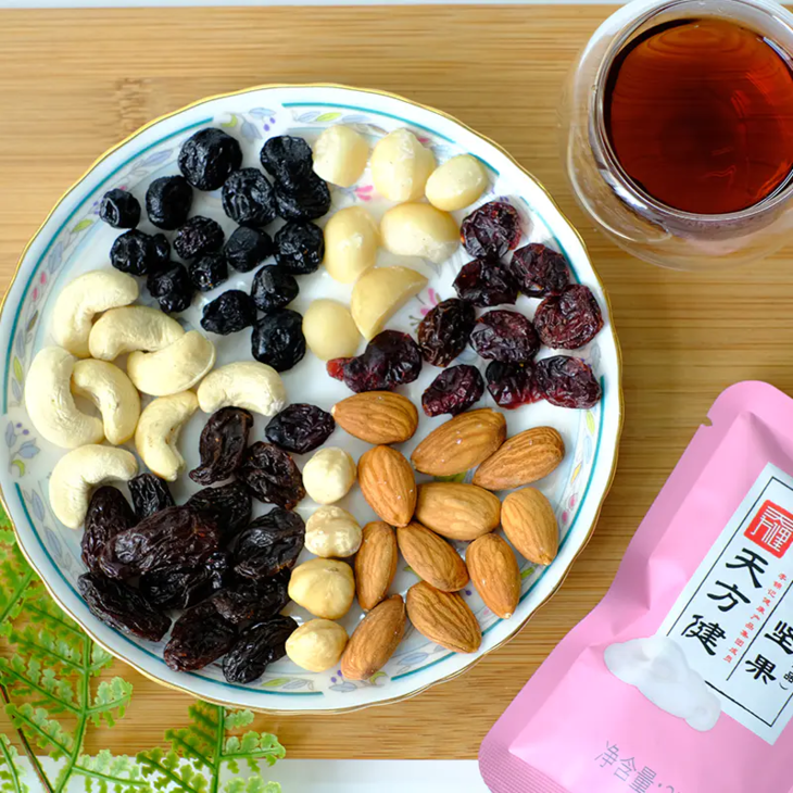 天方健「每日坚果」,选用干湿分离「锁鲜」包装,将“干果”与“软果”分隔开,既保留了扁桃仁、腰果仁、榛子仁、夏威夷果仁的酥脆干果风味,也让蓝莓干、蔓越莓干、葡萄干的软糯香甜口感得到全“鲜”保留。
