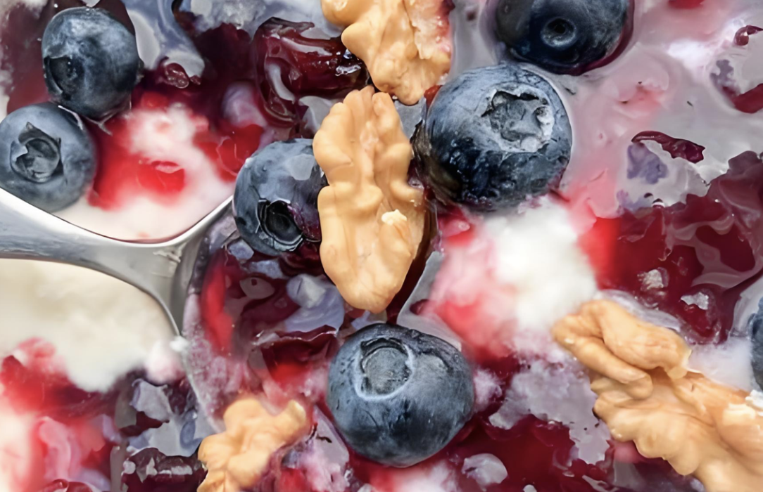 核桃提供优质脂肪和纤维,酸奶(尤其是含益生菌的)提供蛋白质和益生菌,燕麦提供丰富的可溶性膳食纤维。三者结合,能延缓胃排空、稳定血糖、滋养肠道菌群,提供持久的饱腹感和能量。