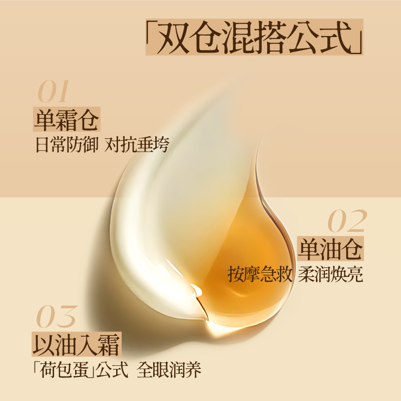 其实眼霜效果不光看成分,手法也很关键:早上取米粒大小霜仓,点涂内眼角到眼尾,用无名指轻轻提拉,最后指腹温敷一下就吸收了。晚上油仓可以单用厚敷,或者和霜混合点压,像做了一个眼周睡眠面膜。切记不要来回拉扯,力度轻,手温能帮成分更好吸收。