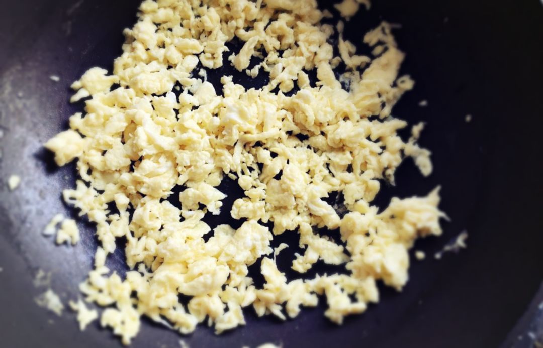 2、热锅凉油,把蛋黄放进去,用筷子迅速滑散,把蛋黄盛出来。