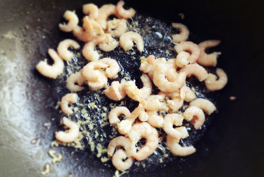 3、葱、姜、蒜爆锅,一小捏盐,3勺水,把虾仁、蛋清放锅里,浇芡汁,滴几滴香油,翻炒两下盛出来。