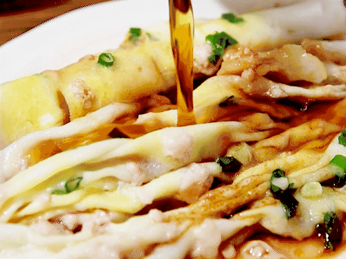 刚出锅的肠粉晶莹剔透,鸡蛋和小料附在粉皮上,淋上秘制料汁,一口下去又滑又嫩,足以唤醒一天的活力。