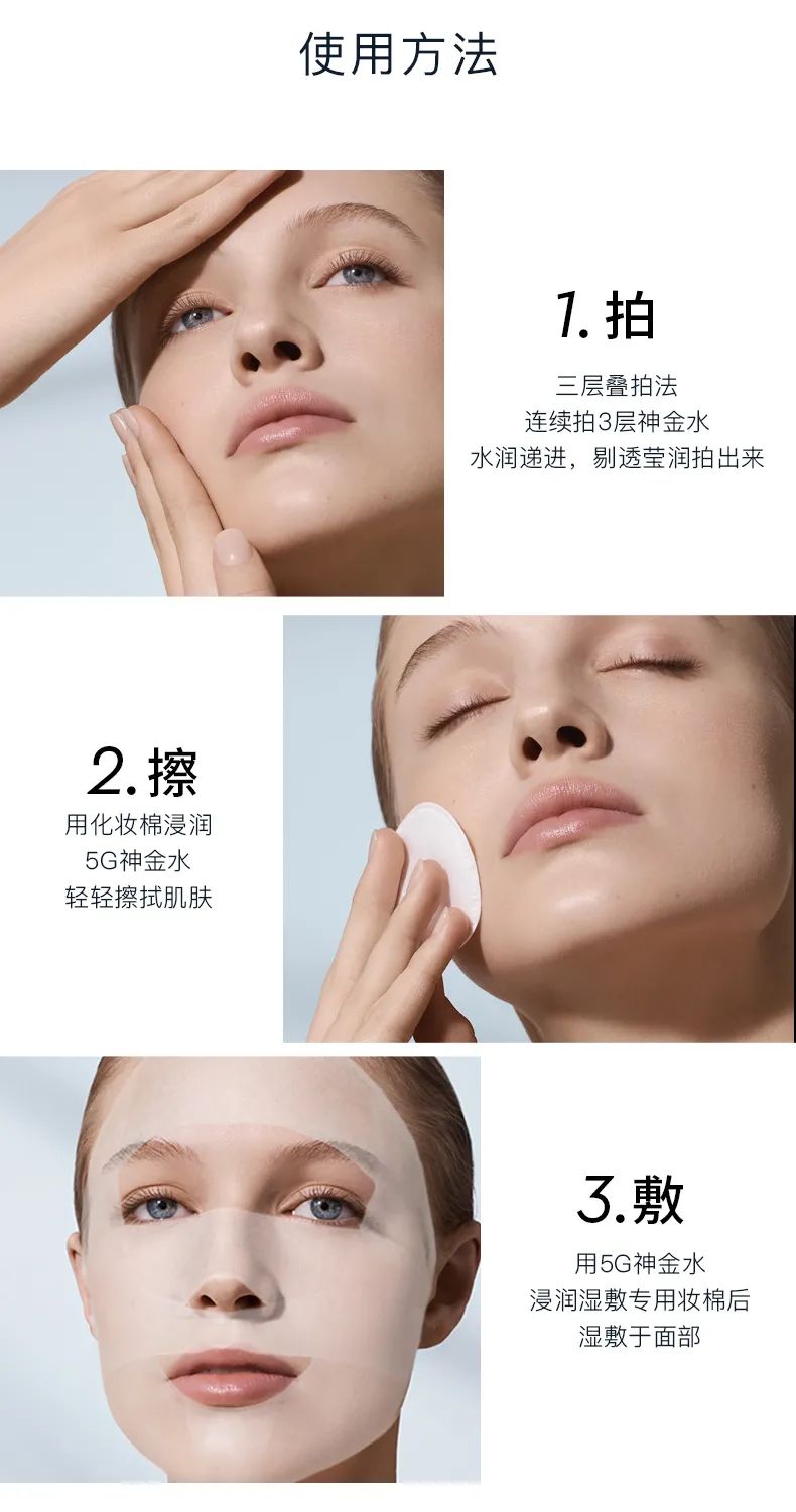 使用方法:早上拍3层清清爽爽,晚上也可以当作补水面膜,化妆棉湿敷在T区、脸颊或全脸5-10分钟;妆前或者敷面膜前再拍一拍。